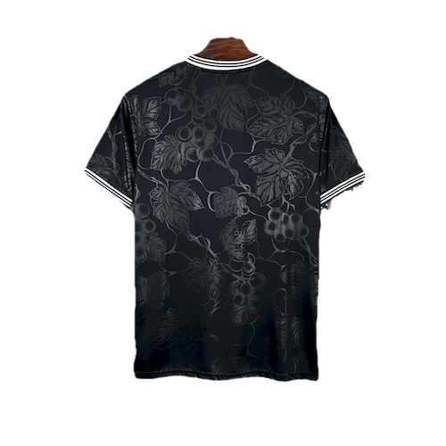 A camisa third da Juventus 25/26 aposta em um visual sofisticado: base Preta, com estampa floral em relevo que cobre toda a peça, trazendo textura e estilo diferenciado. A gola em V preta conta com frisos brancos, combinando com os punhos, reforçando o contraste clássico. O escudo aparece em versão monocromática bordada, ao lado do logo retrô da marca, que adiciona um toque especial ao uniforme alternativo da Vecchia Signora.