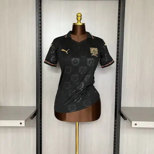 Os detalhes em dourado elevam o design, destacando o escudo de Portugal e o logo da fornecedora no peito. A gola e as mangas contam com acabamento refinado, reforçando o caráter especial do modelo. É uma camisa que representa força, orgulho e identidade, inspirada na tradição portuguesa e na imponência da “Pantera Negra”.