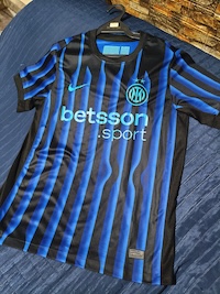 A nova camisa titular da Inter de Milão traz as listras verticais em Azul/Preto, agora aplicadas em blocos irregulares que criam um efeito moderno e dinâmico. A gola é redonda simples em Preto, combinando com os punhos. O escudo bordado aparece em destaque no peito, acompanhado do patrocínio master em Branco, contrastando com a base escura.
